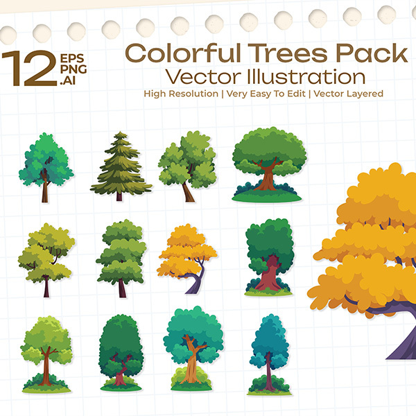 Premium Colorful Trees Pack Vector Illustration – 12 EPS & PNG Files