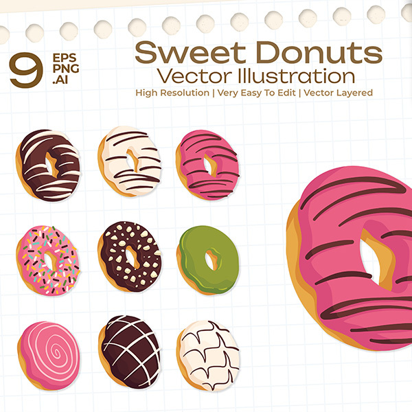 Premium Sweet Donuts Vector Illustration – 9 EPS & PNG Files