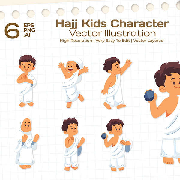 Premium Hajj Kids Character Vector Illustration – 6 EPS & PNG Files